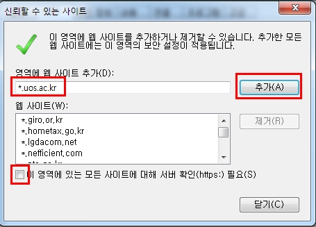 영역에 웹 사이트 추가란에 " *.uos.ac.kr "을 입력하시고