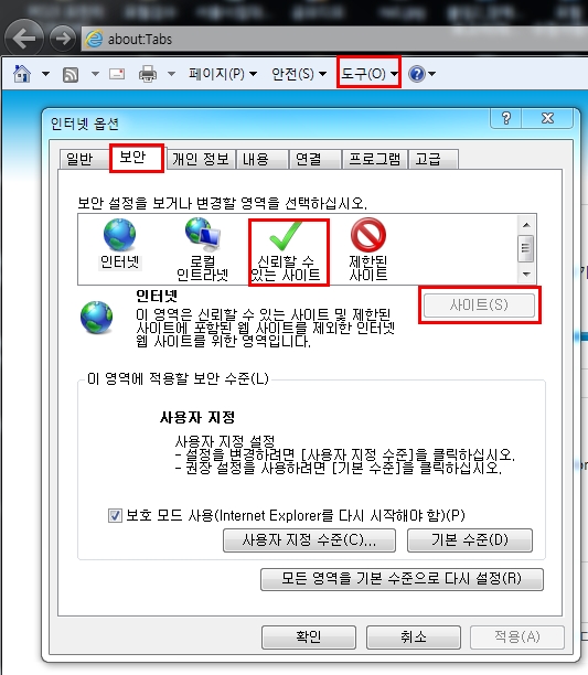 "보안" 탭을 클릭하고 "신뢰할 수 있는 사이트"를 클릭, "사이트"를 클릭합니다.